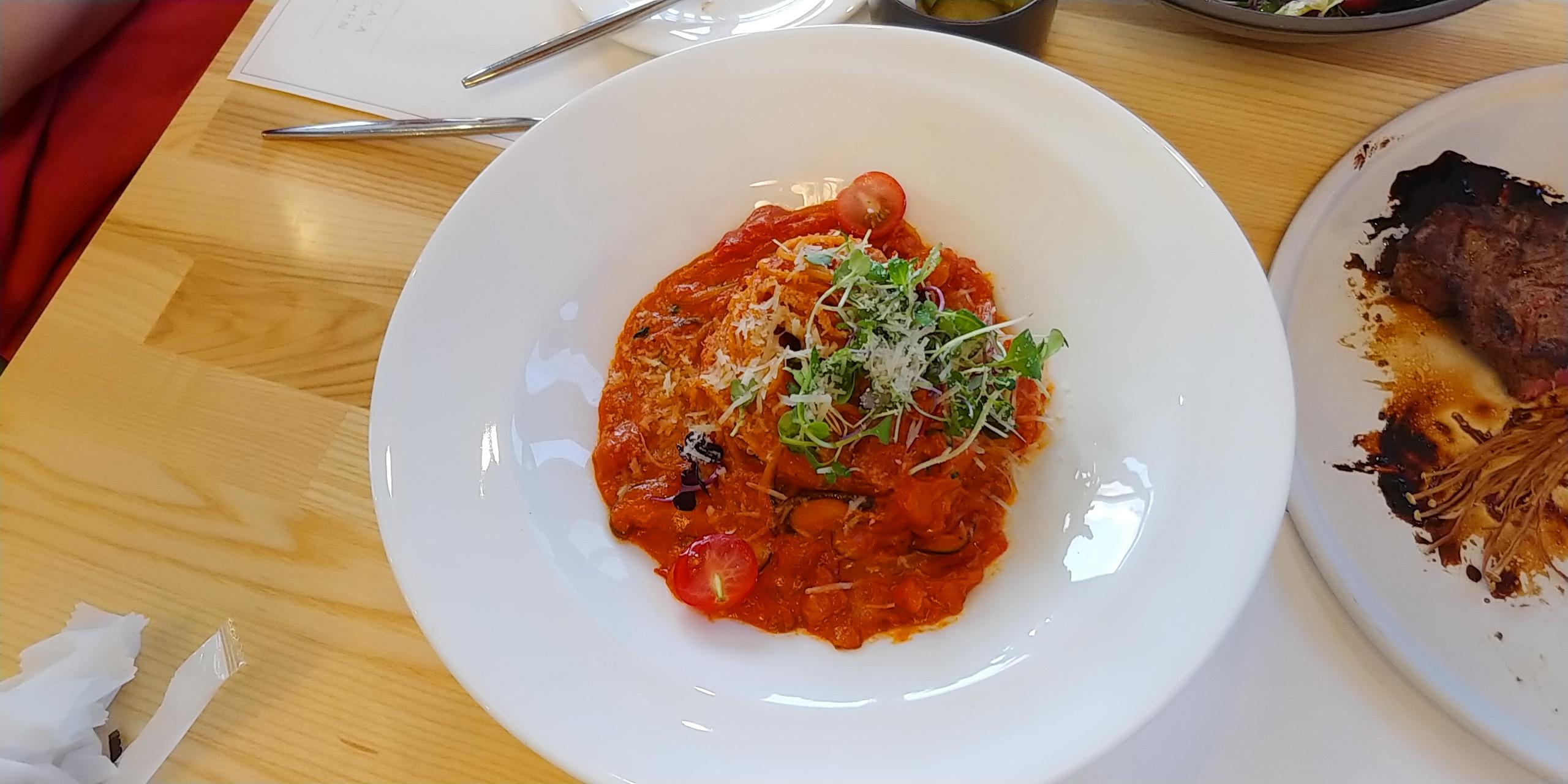 우리가 주문한건 리코타 샐러드, 토마토 파스타, 스테이크 이렇게 3개를 주문했는데..